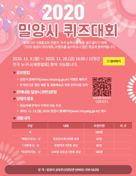 밀양시는 지난 9일부터 오는 20일까지 전국 누구나 참여 가능한 '2020 밀양시 퀴즈대회 이벤트’를 실시한다.