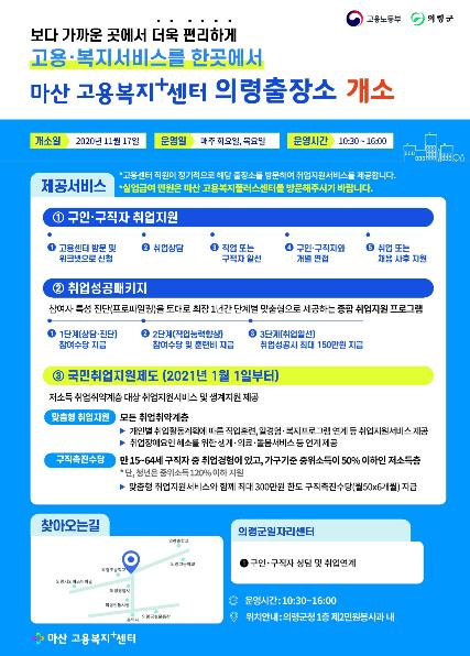 의령군은 취업취약계층의 원할한 취업지원 업무를 위해 마산고용복지플러스센터 의령출장소를 군청내에 이동출장소를 개소하여 운영한다고 밝혔다.