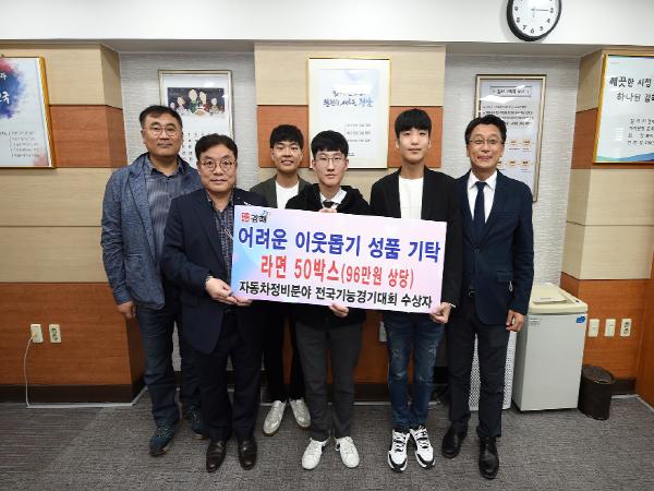 김해건설공업고등학교 중기자동차시스템과 졸업생 및 재학생 3명(이용민, 정성현, 조현준 군)이 자동차 정비 분야 전국기능경기대회에서 각각 금상, 은상, 동상을 수상하여 이를 기념하고자 시상금으로 라면 50박스를 구입하여 따뜻한 나눔을 실천하였다.