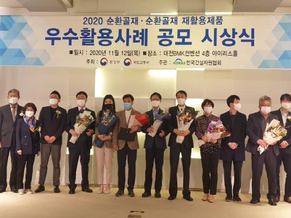 창원시 상수도사업소는 12일 환경부와 국토교통부가 주최하는 ‘2020년 순환골재 재활용제품 우수활용사례 공모 시상식’에서 최우수기관 표창인 국무총리상 수상과 함께 시상금 1백만원을 받았다.
