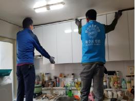 대상가구는 문산읍 소재 장애인 및 독거어르신 2가구로 빗물과 곰팡이로 얼룩진 천정을 수리하고 싱크대를 교체했으며 낡은 연탄 창고문도 새롭게 설치했다.