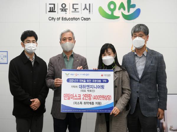오산시는 11월 12일 대하엔지니어링(대표 박화진)에서 관내 저소득층 코로나19 극복에 보탬이 되고자 덴탈마스크 2만매를 기탁했다고 밝혔다.