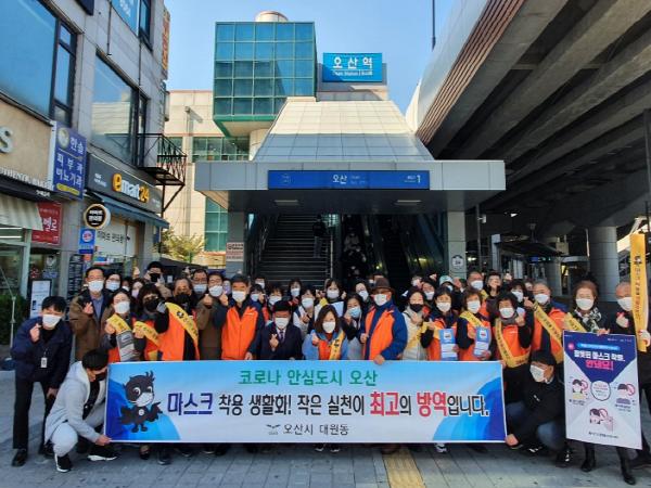 오산시 대원동(동장 강래출)은 대원동 통장협의회(회장 조근호) 주관으로 지난 11일, 대원동 행정복지센터에서부터 오산역 광장에 이르는 구간에 걸쳐 “마스크 착용 의무화 거리 캠페인”을 전개했다.