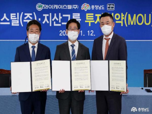 양승조 지사는 12일 도청 상황실에서 장승호 와이케이스틸 상무이사, 한주식 지산그룹 회장, 김홍장 당진시장과 투자양해각서(MOU)를 체결했다.