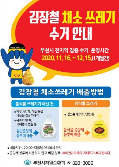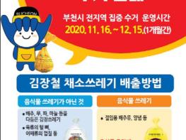 부천시는 채소 쓰레기 배출량이 급증하는 김장철을 앞두고 시민 불편을 최소화하고 깨끗한 거리환경 조성을 위해 11월 16일부터 12월 15일까지 집중 수거 기간을 운영하고 올바른 배출 방법을 함께 홍보한다.