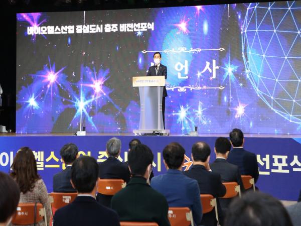 선포식은 충주 최초로 조성되는 바이오헬스국가산업단지 추진 경과발표를 시작으로 바이오헬스산업 추진 동영상 상영, 바이오헬스산업 중심도시를 꿈꾸는 조길형 시장의 선언사로 진행됐다.
