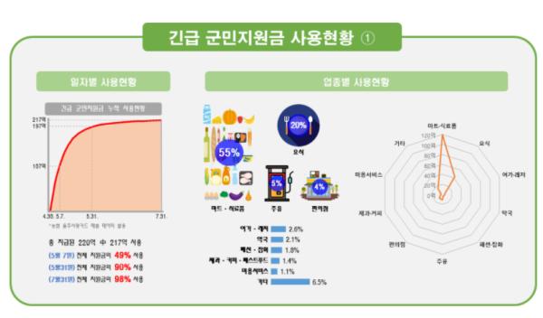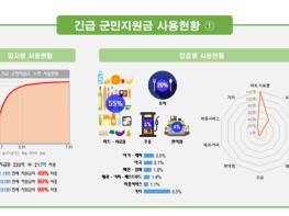 긴급 군민지원금 사용패턴 분석 결과를 보면 10일 만에 약 50%(110억), 5월 말까지 약 90%(197억), 7월 말까지 99.2%(217억)가 사용되었다. 업종별로는 마트?식료품(55%), 요식(20%), 주유(5%), 편의점(4%) 등의 업종에 많이 사용되었다.