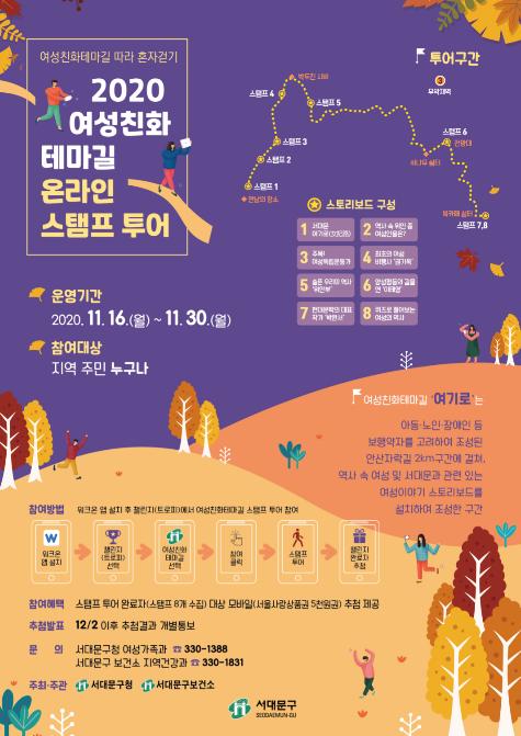 문석진 서대문구청장은 “여성친화테마길 온라인 스탬프 투어가 ‘여성의 역사’에 대한 관심을 높임은 물론 자연 속에서 늦가을의 여유를 찾는 시간이 되길 기대한다”고 말했다.