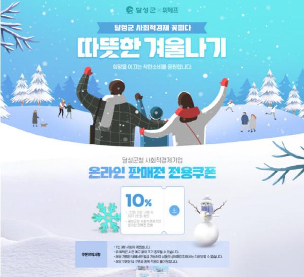 달성군은 ㈜위메프와 함께 코로나19로 인한 오프라인 소비급감으로 위기를 겪고 있는 달성군 사회적경제기업의 온라인 판로개척을 위해 11월 16일부터 12월 말까지 ‘달성군 사회적경제기업 온라인 판매전’을 개최한다.