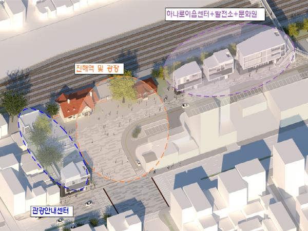 시는 이번 설계공모를 통해 하나로이음센터, 진해문화원, 문화광장 조성을 통해 진해역과 여좌육교 등 주변 경관과 조화로운 공간계획 등의 설계 기본 방향을 제시하여 관광 거점을 조성할 계획이며, 2023년 상반기 준공할 예정이다.