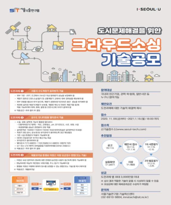 서울특별시 기술연구원은 시민들의 기술 제안과 집단지성을 활용한 도시문제 해결형 크라우드소싱 기술공모를 진행한다고 밝혔다. 도시문제 해결에 관심 있는 일반시민, 관련 학·협회, 국내외 민간기업 등 누구나 참여 가능하다.