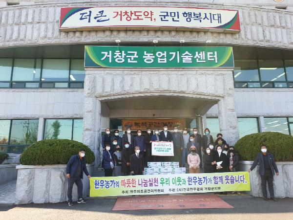 전국한우협회거창군지부(지부장 손정운)는 13일 거창군농업기술센터에서 아동센터 15개소와 노인요양병원 7개소에 한우 불고기 171.6kg(780만 원 상당)의 나눔 전달식을 가졌다.