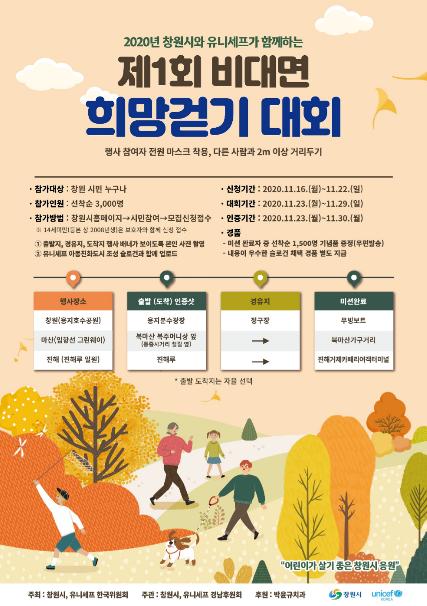 창원시는 ‘어린이가 살기 좋은 아동친화도시 창원’슬로건 공모를 위해 2020년 창원시와 유니세프가 함께하는 제1회 비대면 희망걷기 대회를 개최한다고 13일 밝혔다.