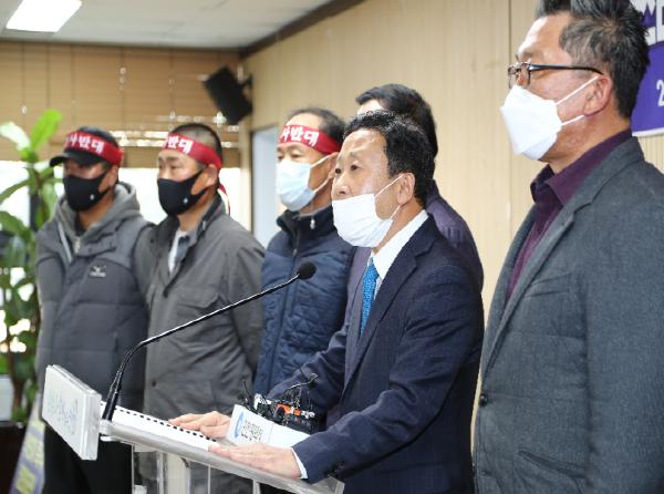 장정민 옹진군수는 12일 인천시청 브리핑룸에서 인천시 쓰레기 자체매립지 후보지 영흥면 발표를 철회할 것을 인천시에 촉구했다.