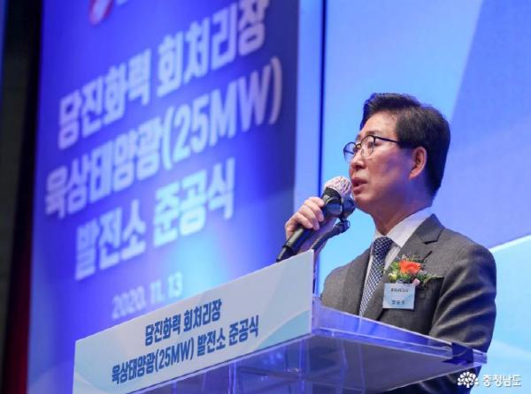 이어 당진시 석문면으로 이동한 양 지사는 한국동서발전 당진화력 제1회처리장 육상태양광 준공식에 참여해 전국 최초로 회처리장을 활용한 태양광발전소 준공을 축하했다.