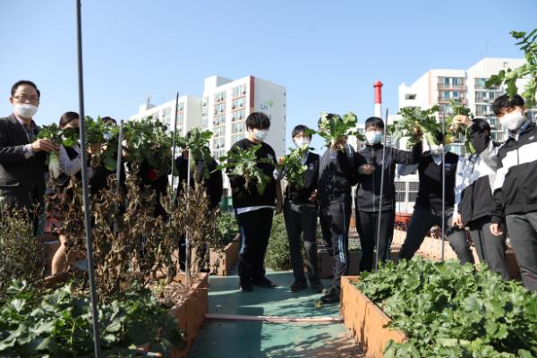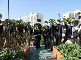 지도교사인 우윤식 생활안전부장은 “우리 농산물의 소중함을 일깨워 주기 위해 아이들과 함께 텃밭을 가꾸기 시작했다”며 “학생들이 체험학습을 통해 정서를 함양하고 수확의 기쁨도 느꼈을 것”이라고 덧붙였다. 학교는 이날 수확한 배추, 무, 고추 등을 학생과 학부모, 교직원에게 나눠줄 예정이다. 옥상에서 보다 안전하게 작물을 기를 수 있도록 텃밭 둘레에 울타리를 치는 공사도 할 계획이다.