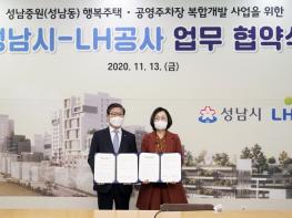 시는 11월 13일 은수미 성남시장과 변창흠 한국토지주택공사(LH) 사장, 윤영찬 국회의원, 지역구 시의원, 주민대표 등이 참석한 가운데 ‘성남중원 행복주택· 공영주차장 복합개발사업’ 추진을 위한 업무협약을 체결했다.