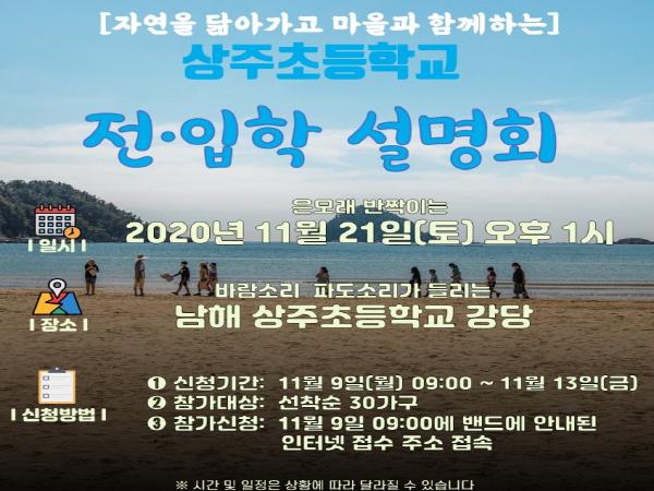 남해군은 오는 21일 ‘작은 학교 살리기 프로젝트 전·입학설명회’를 상주초등학교 강당에서 개최 할 예정이라고 밝혔다