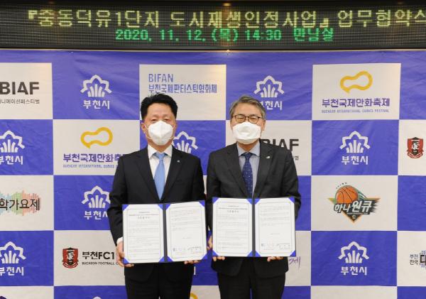 부천시는 지난 12일 시청 만남실에서 한국토지주택공사(LH)와 ‘중동덕유1단지 도시재생인정사업’ 협약식이 열렸다.