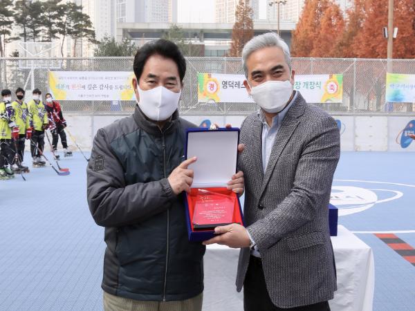 백군기 용인시장은 15일 기흥구 영덕동 영덕레스피아에 조성된 인라인하키장 개장식에 참여해 관계자들을 격려했다.