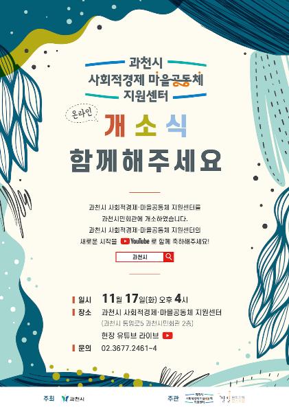 과천시는 오는 17일 오후 4시, 과천시 시민회관 2층에서 사회적경제 마을공동체 지원센터 개소식을 진행한다.