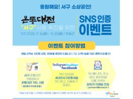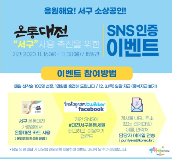 대전 서구는 코로나19 장기화로 어려움을 겪는 서구 소상공인을 응원하고 침체한 지역경제의 활성화를 위하여 이달 16일부터 30일까지 온통대전 서구 사용 SNS 인증 이벤트를 추진한다고 밝혔다.