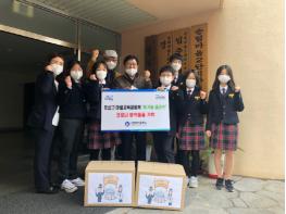 이날 담임교사와 학생들은 마을교육공동체 활동을 통해 직접 제작한 마을지도, 마스크줄, 소독티슈·소독제가 담긴 꾸러미 50세트를 송림마을2단지아파트 경로당에 전달했다.
