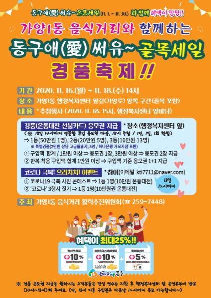 이와 함께 ‘코로나 극복! 으라차차! 이벤트’로서 ▲코로나19 극복 사진 콘테스트 ▲‘코로나’ 3행시 짓기도 진행되며, 추첨 행사에서는 난타공연, 노래공연, 색소폰·클라리넷 악기연주 등 상권별 색다른 볼거리가 제공된다.