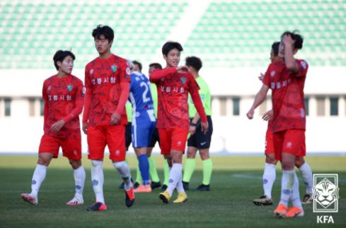 강릉시청축구단이 부산교통공사축구단의 도전을 물리치고 2라운드에 진출했다.
