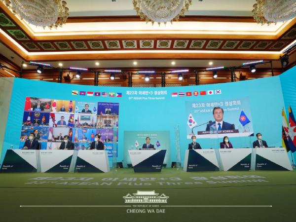 문재인 대통령은 14일 화상으로 개최된 제23차 아세안 3 정상회의에 참석했다.