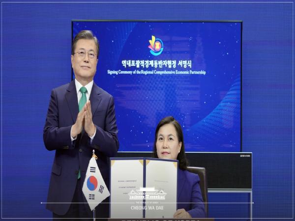 문재인 대통령은 14일 화상으로 개최된 제4차 역내포괄적경제동반자협정(RCEP) 정상회의에 참석해 RCEP 협정이 최종 타결됐음을 확인하고, 이후 이어진 협정 서명식에 참석했다.