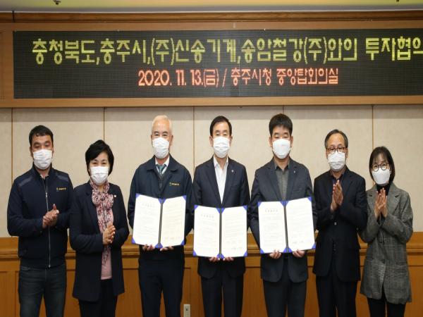 충청북도와 충주시는 13일 충주시청 중앙탑회의실에서 ㈜신송기계와 송암철강㈜ 2개 사와 87억 원 규모의 투자협약을 체결했다.