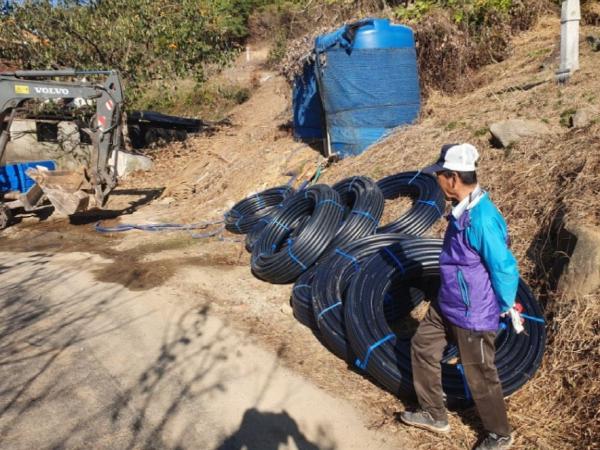16일 상관면은 산정마을의 농업용수 해결을 위해 마을에서 약 1킬로미터 떨어진 계곡수를 마을까지 연결해 주던 기존의 좁은 파이프를 30mm로 확대하고 대형 물통 3개를 설치했다고 밝혔다.