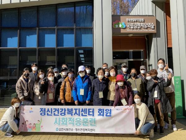 증산면 수도리 소재 국립김천치유의숲에서 진행한 사회적응훈련은 코로나19로 인해 외부활동을 하지 못하면서 지친 정신장애인들의 정서적 안정을 도모하기 위해 산림치유 프로그램으로 숲길 산책과 산림욕 및 웰니스 테라피 스트레칭 등 다양한 프로그램을 실시하여 심신의 치유 및 힐링 시간을 마련하였다.