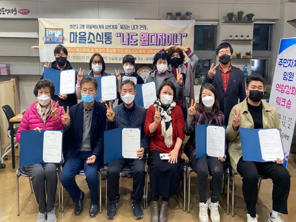 대구 서구 비산2?3동 마을복지계획단에서는 11일 비산2.3동 달성토성마을 다락방에서 마을복지계획 실행사업으로 마을소식통 ‘나도 웹디자이너’웹포스터 만들기 교육 수료식을 가졌다.