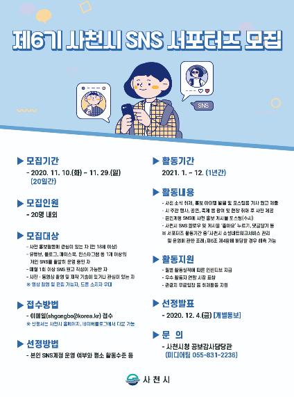 사천시는 유익하고 흥미 있는 생활 속 다양한 콘텐츠 제공으로 시민과 소통의 장을 마련할 ‘제6기 SNS 서포터즈’를 모집한다고 12일 밝혔다.