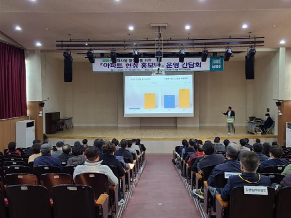남양주시 와부·조안 행정복지센터(센터장 권혁무)는 지난 13일 주민자치센터 4층 미디어센터에서 「아파트 현장 홍보단」의 원활한 운영을 위하여 아파트 현장 홍보단(팀장급 간부)와 아파트 입주자대표, 관리소장, 이장 등 119명이 참석한 간담회를 진행하였다.