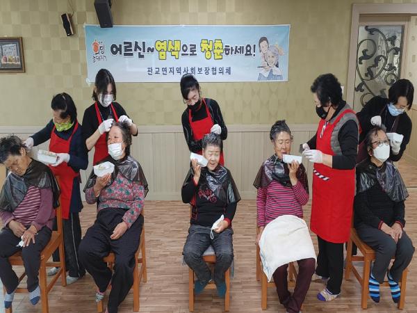 서천군 판교면지역사회보장협의체가 지난 11일 판교행복경로당에서 어르신 10여 명을 대상으로 찾아가는 새치염색 사업을 실시했다.