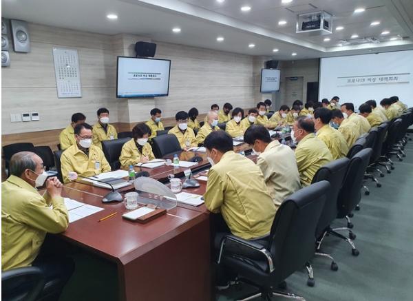청도군은 11. 16(월) 08:00 제1회의실에서 관과소장 및 읍면장이 참석한 가운데 ‘코로나19 대응 비상대책 회의’를 실시하였다.