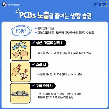 폴리염화비페닐(PCBs)는 육류?어류 등 주로 지방 함량이 높은 식품에 많으므로 껍질, 내장 섭취를 줄이고, 튀기기보다는 삶아 먹는 것이 좋다.