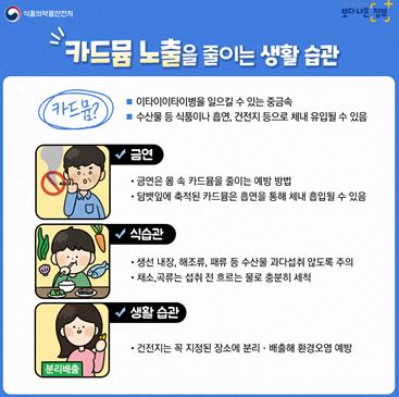 카드뮴은 식품, 흡연 등을 통해 노출될 수 있지만 생선내장의 과다 섭취를 주의하고, 채소?곡류 등은 흐르는 물로 잘 씻어 섭취하며, 금연 등을 통해서 노출을 줄일 수 있다.