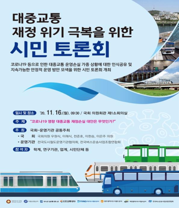 토론회에서는 코로나19로 인해 악화된 지하철, 버스 등 대중교통 운영기관의 재정 상황을 분석하고, 지속적인 교통서비스 제공을 위한 재정분담 구조개선 등에 대한 논의도 펼칠 예정이다.