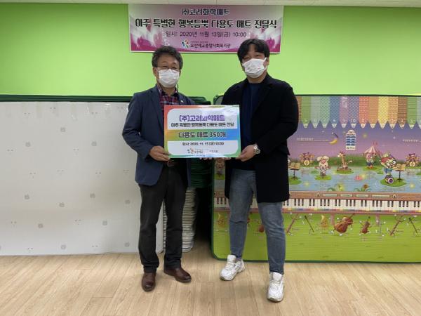 강대봉 관장은 “요즘같이 어려운 시기에 따뜻한 사랑의 온기를 담아 행복을 전달해준 윤여산 대표를 비롯한 임직원분들에게 감사인사를 전한다. 앞으로도 ㈜고려화학매트의 지속적인 성장으로 행복나눔 공동체를 함께 만들어가는 디딤돌이 되어주길 바란다”라고 전했다.