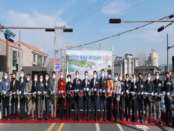 함양군은 16일 오후 읍?시가지내?홍수피해?예방과?치수?안정성?확보를?위하여?준공된 지 36년이 경과한 돌북교?재가설 공사를 완료하고 이를 축하하는 준공식 행사를 개최했다.