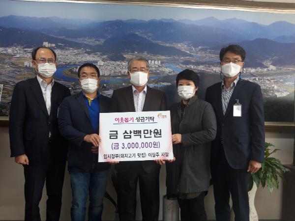 밀양시는 임시정부(돼지고기 맛집, 대표 이상주)에서 16일 밀양시를 방문해 어려운 이웃을 위해 사용해 달라며 성금 300만원을 기탁했다고 전했다.