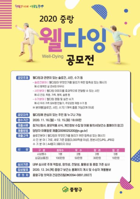 서울특별시 중랑구가 ‘웰다잉(Well-Dying) 공모전’을 개최한다. 구는 16일부터 다음달 15일까지 ‘웰다잉으로 행복한 삶·준비된 마무리’를 주제로 공모전을 진행한다고 밝혔다.
