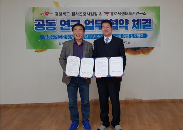 경상북도 잠사곤충사업장은 16일 홀로세생태보존연구소 회의실에서 멸종위기 곤충 및 생물다양성 보존 증식기술 개발을 위해 (사)홀로세 생태보존연구소(소장 이강운)과 공동연구 협약(MOU)을 체결했다.