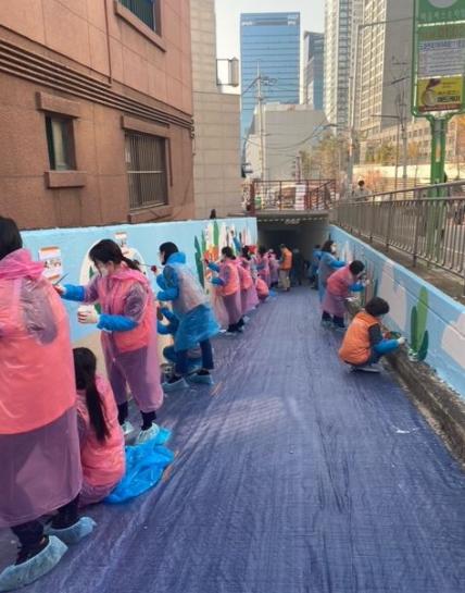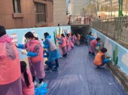 마포구가 최근 한화손해보험, 전국재해구호협회와 함께 공덕역 인근의 노후화된 골목길에 벽화그리기 봉사활동을 실시하고 지역 주민을 위한 안전한 골목길 환경 조성을 지속하고 있다.