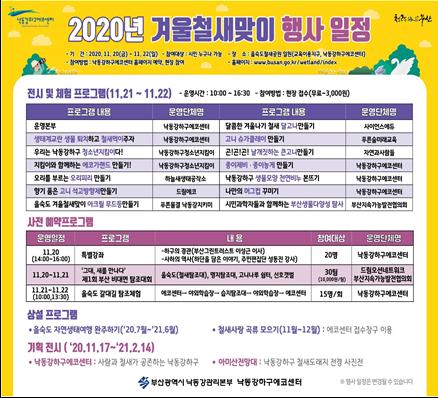 이번 행사는 낙동강 하류 철새도래지(천연기념물 179호)를 찾아오는 겨울 철새에 관한 정보 제공, 낙동강하구의 아름다움 및 생태환경보전의 중요성 확산, 지역 탐조인 확대 등을 목적으로 하며, ▲철새 먹이 주기, 오리피리 만들기 등 총 13종의 전시 및 체험 프로그램 ▲제1회 부산 비대면 탐조대회 ▲갈대길 탐조 체험 ▲특별전 및 특별강좌 ▲철새사랑 곡류 모으기 등 시민들이 직접 참여해 즐길 수 있는 콘텐츠로 구성되었다.