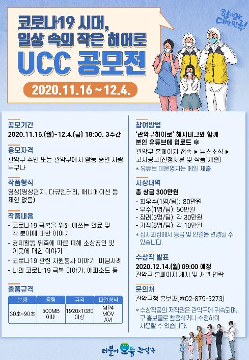 관악구가 코로나19 극복을 위해 애써온 구민들의 사기를 높이고자 12월 4일까지 ‘2020 일상속의 작은 히어로 UCC 공모전’을 개최한다고 밝혔다.